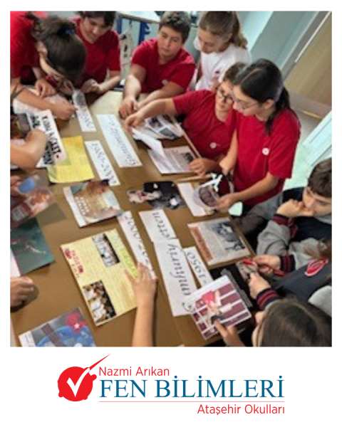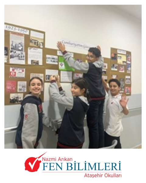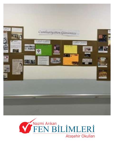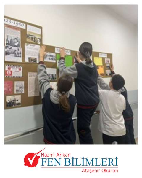 Cumhuriyet Haftası kapsamında 7. sınıf öğrencilerimizle, cumhuriyetin kuruluşundan günümüze kadar sosyal, siyasal, kültürel, bilimsel ve sportif alanlardaki gelişmeleri içeren bir “Zaman Tüneli” çalışması gerçekleştirdik. Bu etkinlikle öğrencilerimiz, cumhuriyetin ilanından itibaren ülkemizin geçirdiği büyük değişimleri somut örneklerle gözlemleme fırsatı buldular. Cumhuriyetimizin 102. yılını kutlarken, bu çalışma ile öğrencilerimizde millî bilinç, tarihsel farkındalık ve gelecek kuşaklara karşı sorumluluk duygusunu pekiştirmeyi amaçladık.