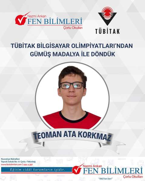 sınıf öğrencimiz Teoman Ata Korkmaz, 14-16 Aralık tarihlerinde düzenlenen TÜBİTAK Bilim Olimpiyatları Bilgisayar dalında geleceğin teknolojilerine yön verme yolunda gösterdiği üstün başarıyla GÜMÜŞ MADALYA kazandı.
