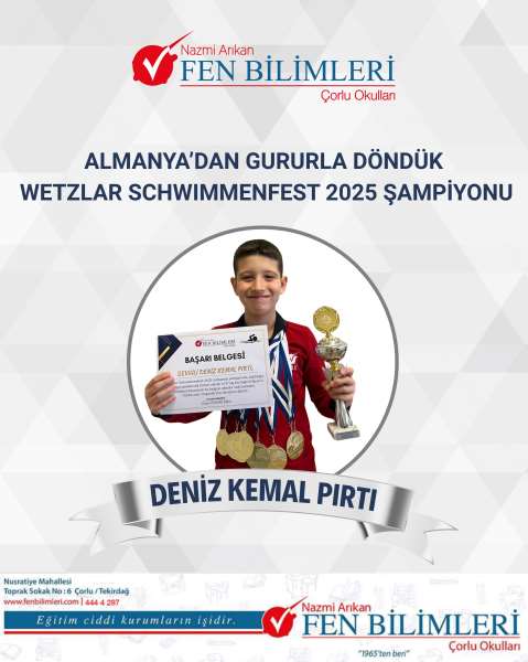 Okulumuz 4. sınıf öğrencilerinden Deniz Kemal Pırtı, Wetzlar Schwimmenfest 2025 (Almanya) yarışlarında katıldığı 8 yüzme yarışının tamamında birinci olarak büyük bir başarıya imza atmış ve 9 Yaş En Değerli Sporcu ödülünü kazanmıştır.