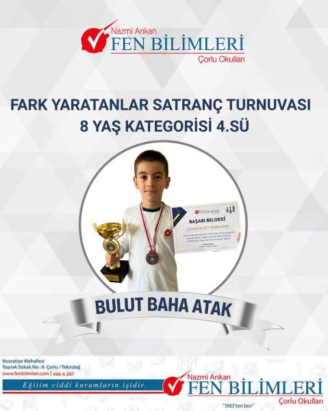 Öğrencimiz Bulut Baha Atak, “Fark Yaratanlar Satranç Turnuvası, 8 Yaş Kategorisinde” gösterdiği başarılı performansla 4.lük elde etmiştir.