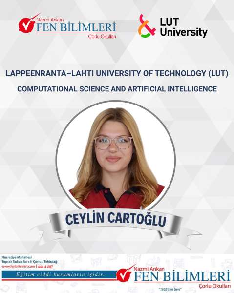 12. sınıf öğrencimiz Ceylin Cartoğlu, dünyanın en prestijli teknik üniversitelerinden biri olan Finlandiya’daki Lappeenranta-Lahti University of Technology (LUT) – Lappeenranta-Lahti Teknoloji Üniversitesinden kabul almıştır.